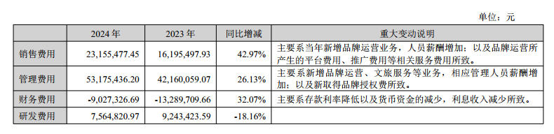 2024年,中胤时尚销售、管理费用上升,研发费用下降。销售费用为2315.55万元,同比增长42.97%。主要原因是新增品牌运营业务,人员薪酬增加,以及品牌运营产生的平台费用、推广费用等相关服务费用所致。这表明公司在拓展市场和品牌推广方面加大了投入。