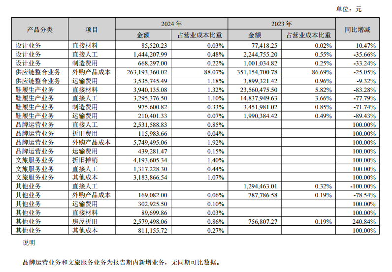 值得注意的是,尽管鞋履生产业务占比一直不高,但2024年占营收比重较同期下降84.74%。