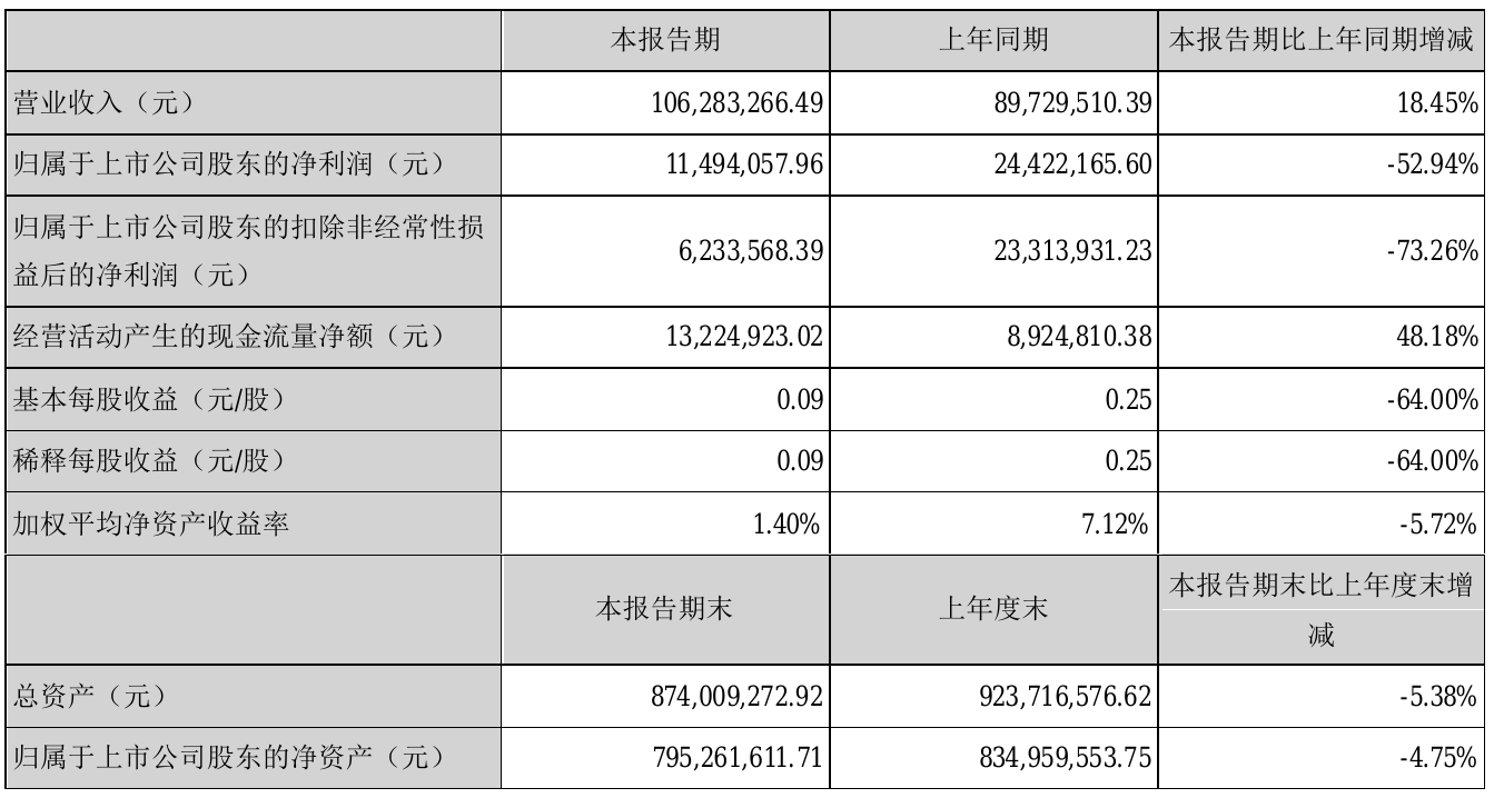 挖贝网8月26日,国安达(300902)近日发布2021年半年度报告,报告期内营业收入106,283,266.49元,同比增加18.45%;净利11,494,057.96元,同比净利减少52.94%。