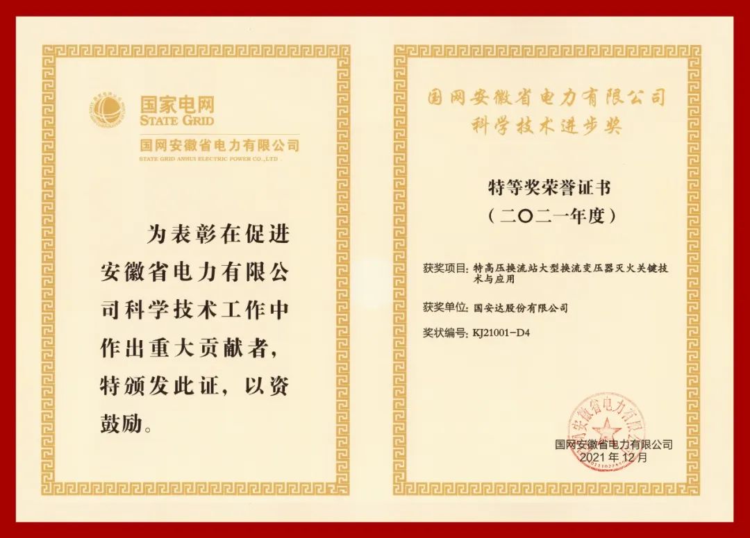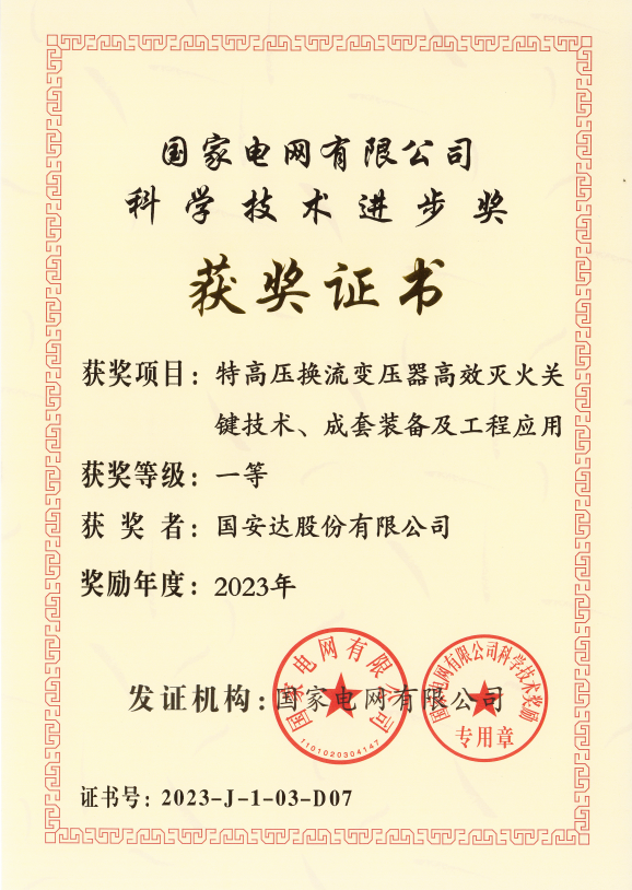 近日,2023年度国家电网有限公司科学技术奖获奖项目正式公布,国安达创新科技成果“特高压换流变压器高效灭火关键技术、成套装备及工程应用”荣获科学技术进步一等奖。