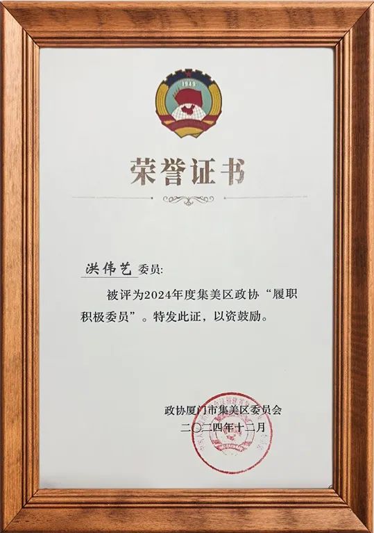 会议期间,洪伟艺荣获2024年度集美区政协“履职积极委员”称号,这是对其积极参政议政、为集美区发展建言献策的高度认可,也彰显了国安达的社会责任与担当。