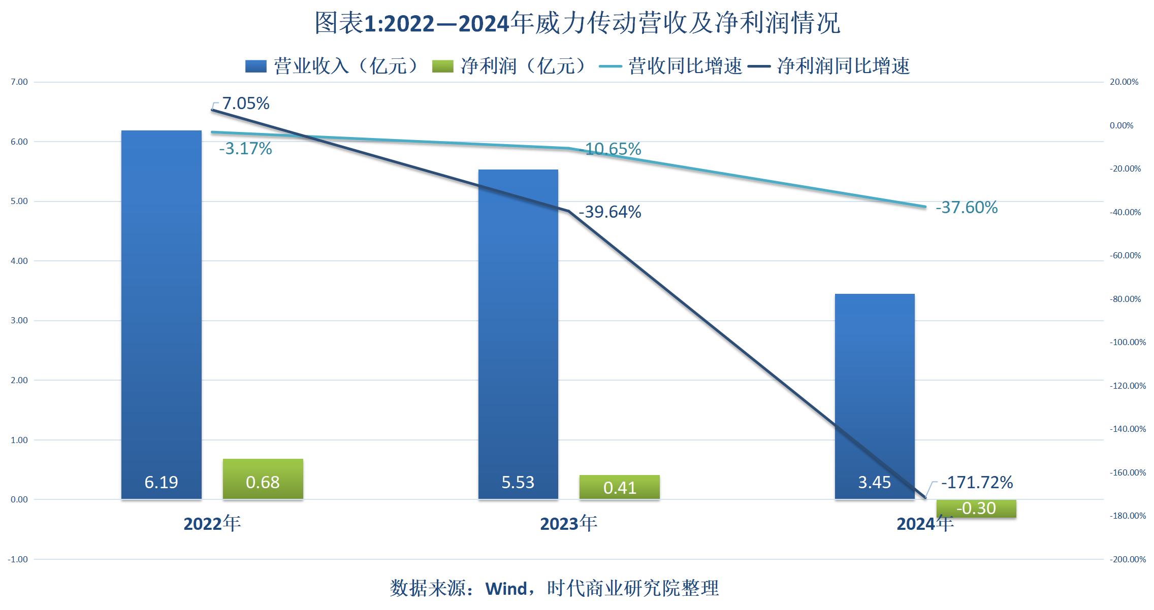 4月26日,威力传动发布的2024年年报显示,该公司营收、净利润分别为3.45亿元、-0.30亿元,同比增速分别为-37.60%、-171.72%,且净利润由盈转亏。自2023年8月登陆创业板以来,威力传动已连续两年上演业绩“跳水”剧情。