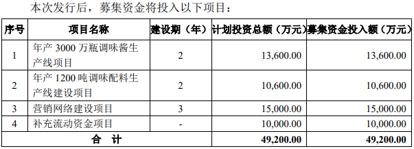 招股书显示,仲景食品共募集资金9.13亿元,其中4.92亿元募集资金计划分别投资于“年产3000万瓶调味酱生产线项目”、“年产 1200 吨调味配料生产线建设项目”、“营销网络建设项目”、以及“补充流动资金项目”。