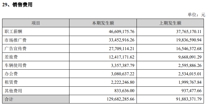 细究去年的营收增长,仲景食品销售费用增速也远高于同期营收增速。2021年,公司销售费用支出为1.30亿元,同比增长41.14%。财报显示,公司当期无论是职工薪酬或是市场推广费、广告宣传费均出现了激增。