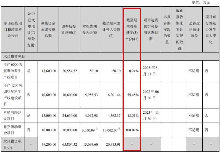 到2022年4月11日,公司又审议通过了《关于调整部分募集资金投资项目实施进度的议案》,同意将年产1200吨调味配料生产线建设项目达到预定可使用状态的日期调整为2022年6 月30日,年产6000万瓶调味酱生产线项目达到预定可使用状态的日期则调整2025年5月31 日。