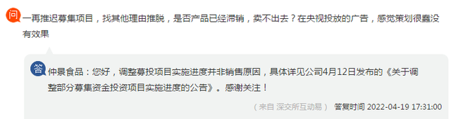 有投资者在互动易上直言怼董秘,“一再推迟募集项目,找其他理由推脱,是否产品已经滞销,卖不出去?在央视投放的广告,感觉策划很蠢没有效果”。,