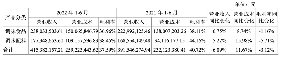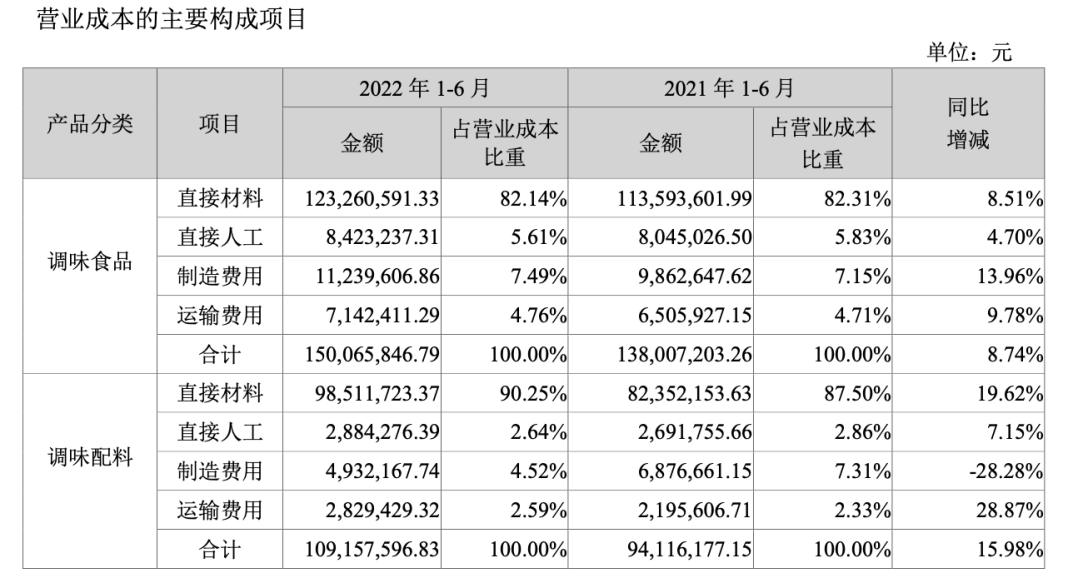 报告期内,调味食品实现营业收入2.38亿元,同比增长6.75%,毛利率达到36.96%,同比下降1.16%,调味配料实现营收1.77亿元,同比增长5.22%,毛利率38.45%,同比下降5.71%。总的来看,两者营收都有增长,但毛利率都有所下降,可以较为直观地从下图看到,其原因在于营业成本也在同比增长。