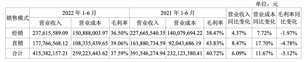 目前,仲景食品的调味食品已覆盖了以沃尔玛、华润万家、永辉超市为代表的超过十万零售终端,同时也进入了部分外卖平台、生鲜到家平台及连锁餐饮渠道。从半年报里可以看到,报告期内,其销售模式主要分为经销和直销两种,其中经销实现营业收入2.37亿元,同比增长4.37%,直销实现营收1.77亿元,同比增长8.47%。但毛利率同比均有下降,其中直销毛利下降幅度较大。