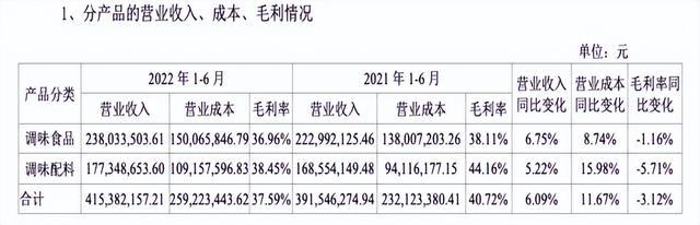 目前,调味食品依然是仲景食品的主业,占总营收的57.30%。具体来看,今年上半年调味食品营业收入为2.38亿元,同比增长了6.75%;调味配料的营业收入为1.77亿元,同比增长了5.22%。