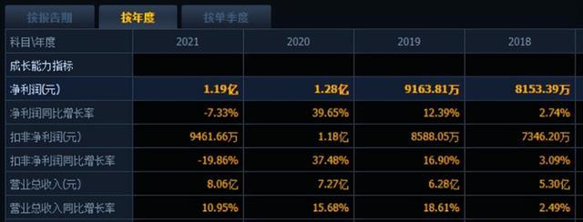 2019年至2021年,仲景食品营业收入分别为6.28亿元、7.27亿元、8.06亿元,增速分别为18.61%、15.68%、10.95%,同期净利润分别为9163.81万元、1.28亿元、1.19亿元,同比增长12.39%、39.65%、-7.33%。