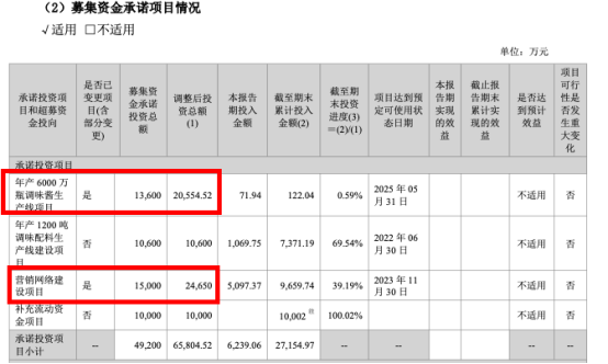 根据目前调整后的投资情况,“营销网络建设项目”与“年产6000万瓶调味酱生产线项目”的实际投资额都比承诺投资总额高,分别为2.47亿元、2.06亿元。