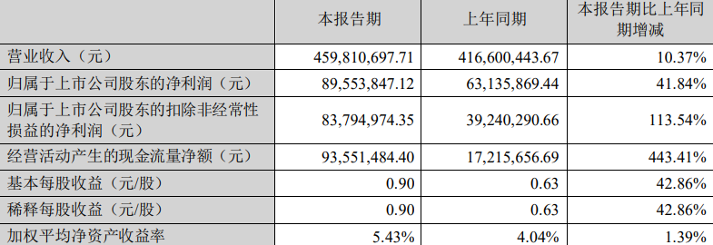 8月7日晚间,仲景食品股份有限公司(下称“仲景食品”)发布2023年半年度报告。今年上半年,仲景食品实现营收4.6亿元,同比增长10.37%;实现归属净利润8955.38万元,同比增长41.84%;更能彰显主业的扣非净利润录得8379.5万元,同比增长113.54%。经营活动产生的现金流量净额更是暴涨443.41%至9355.15万元。