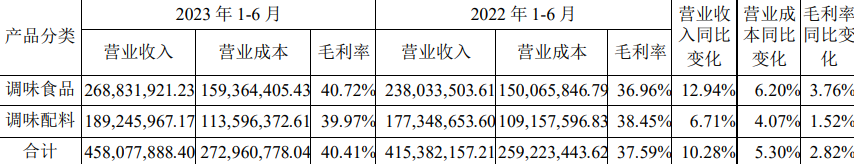 而从销售数量上看,报告期内,仲景食品的调味品业务销售量同比增长了12.83%;调味配料的销售量同比增长了3.76%。均低于销售额的同比增幅,换而言之,仲景食品在上半年应该是对部分产品进行了价格调整。