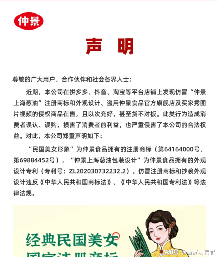 对此,仲景食品声明:“民国美女形象”为仲景食品拥有的注册商标(第64164000号、第69884452号),“仲景上海葱油包装设计”为仲景食品拥有的外观设计专利(专利号:ZL202030732232.2)。仿冒注册商标和抄袭外观设计违反《中华人民共和国商标法》《中华人民共和国专利法》等法律法规。