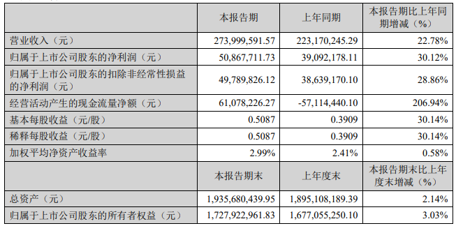 4月18日,仲景食品发布2024年第一季度报告。数据显示,公司一季度实现营业收入2.74亿元,同比增长22.78%;归属于上市公司股东的净利润5086.77万元,同比增长30.12%。截至报告期末,仲景食品总资产为19.36亿元,归属于上市公司股东的所有者权益为17.28亿元。