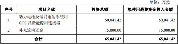 公司本次向不特定对象发行可转换公司债券拟募集资金总额不超过65,041.42万元(含65,041.42万元)。扣除发行费用后,本次募集资金将用于动力电池及储能电池系统用CCS及新能源用连接器项目和补充流动资金项目。