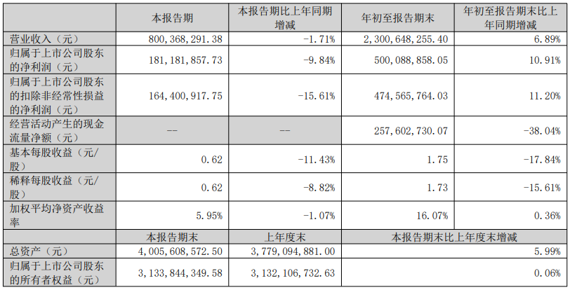 报告显示,瑞丰新材第三季度实现营收8.00亿元,相较去年同比下降1.71%,前三季度营收23.01亿元,同比增长6.89%;第三季度归母净利润为1.81亿元,同比下滑9.84%,前三季度归母净利润为5.00亿元,同比增长10.91%。