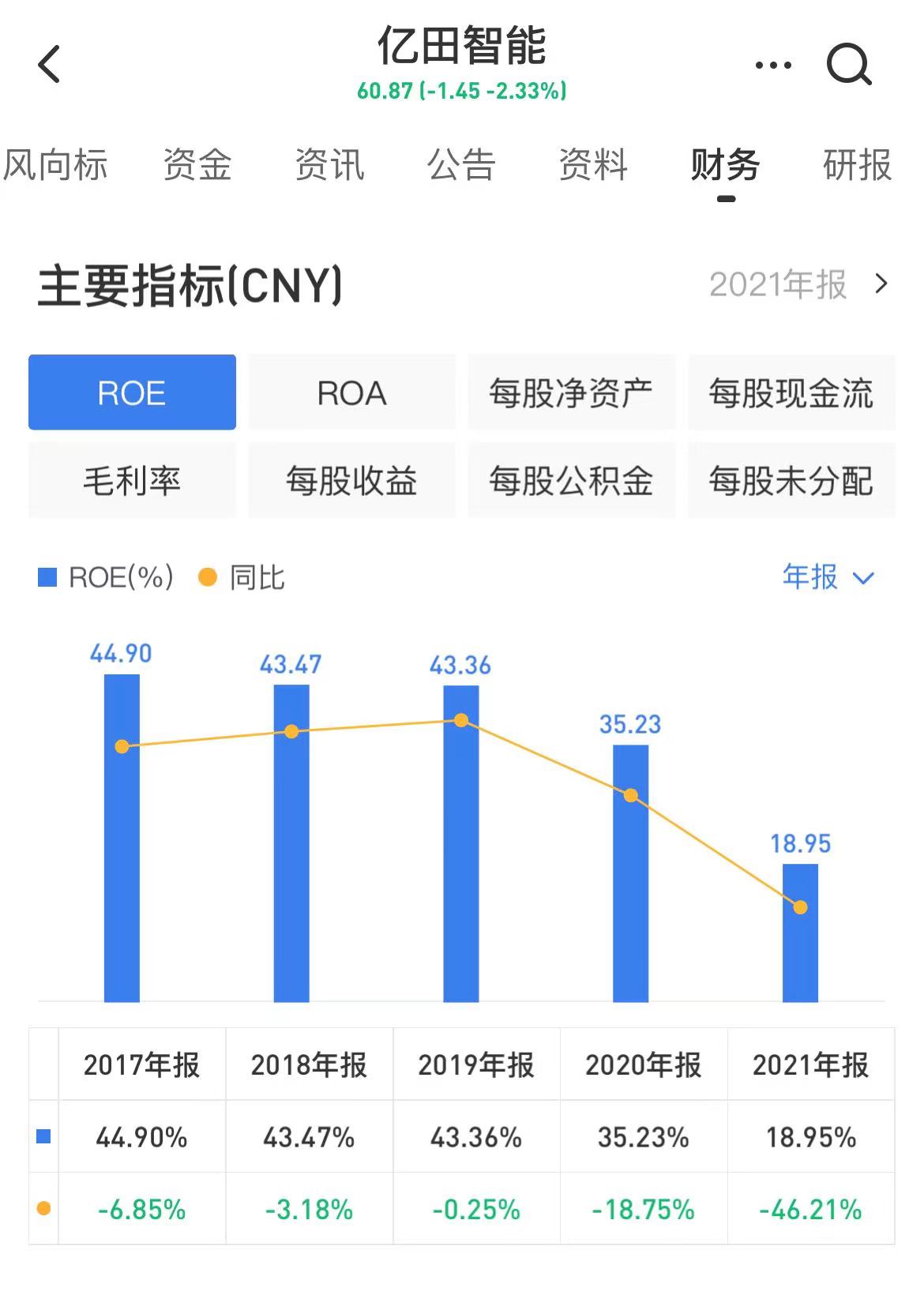 值得注意的是,亿田智能的ROE连续五年下降。2017年-2021年,其ROE分别为44.9%、43.47%、43.36%、35.23%及18.95%。