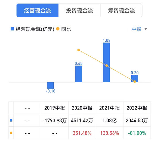 拉长时间线来看,2019年上半年,亿田智能的经营现金流为负值,2020年上半年,其经营现金流从负值跃升至0.45亿元,上升了351.48%,2021年上半年达到最高值,为1.08亿元,然而,2022年中期,亿田智能的经营现金流下降至0.2亿元,还不足2020年中期的一半。