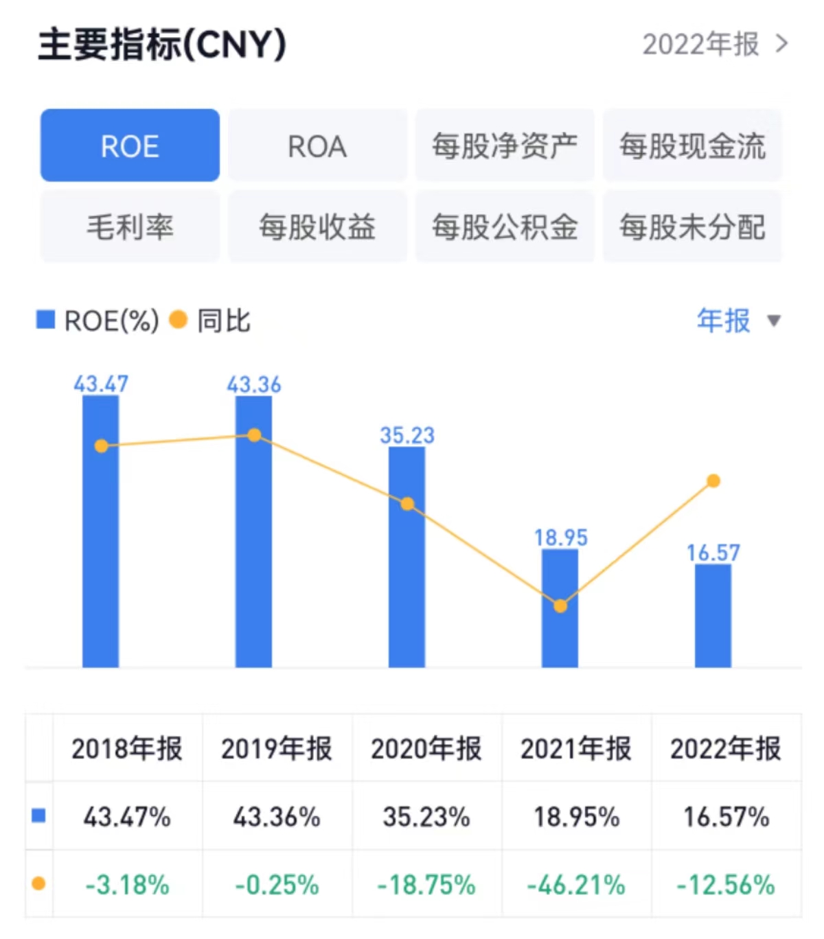 2018年至2022年,亿田智能ROE分别为43.47%、43.36%、35.23%、18.95%、16.57%。