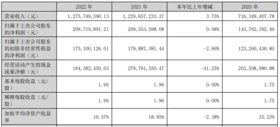 亿田智能昨晚披露的2022年年度报告显示,去年公司实现营业收入12.76亿元,同比增长3.75%;归属于上市公司股东的净利润2.10亿元,同比增长0.08%;归属于上市公司股东的扣除非经常性损益的净利润1.75亿元,同比下降2.66%;经营活动产生的现金流量净额1.64亿元,同比下降41.25%。