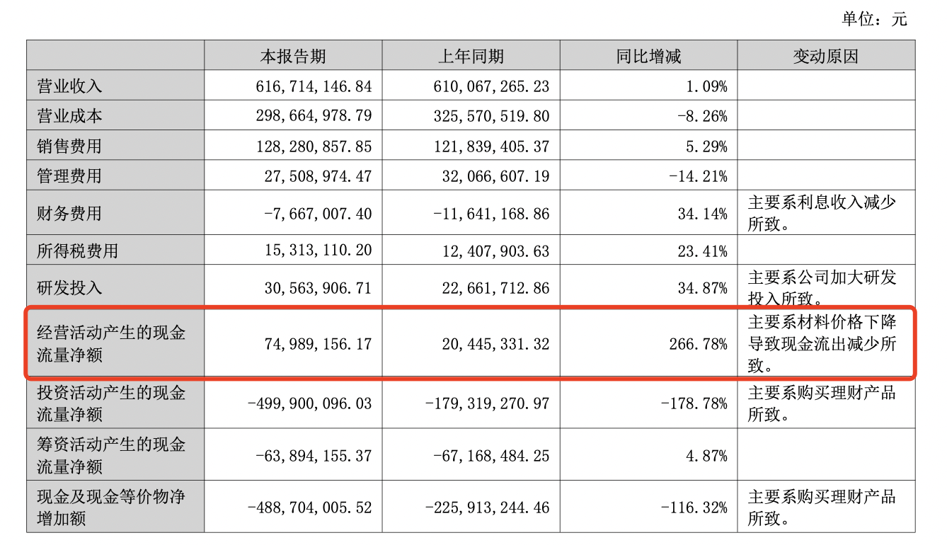 值得一提的是,公司的经营活动产生的现金流量净额为7498.92万元,同比增长266.78%。对此,其解释称,主要系材料价格下降导致现金流出减少所致。