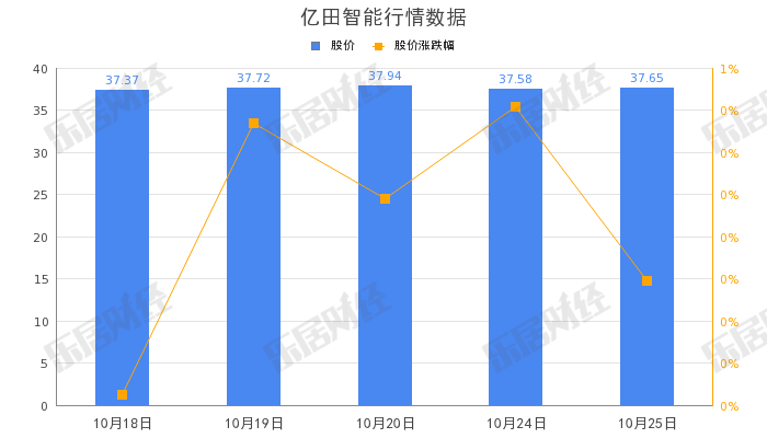 截至10月25日,亿田智能(300911.SZ)股价收盘37.58元,涨0.19%,成交总额3,760.65万元,总市值40.37亿元。