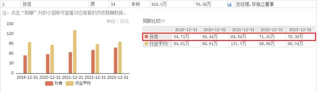 此外,孙吉去年的薪酬为78.39万元。从2019年的54.72万到2021年的64.54万再到2023年的78.39万,已连续四年涨薪。去年的年薪在已公开高管中仅次于董事长孙伟勇,孙伟勇的年薪为80.94万。