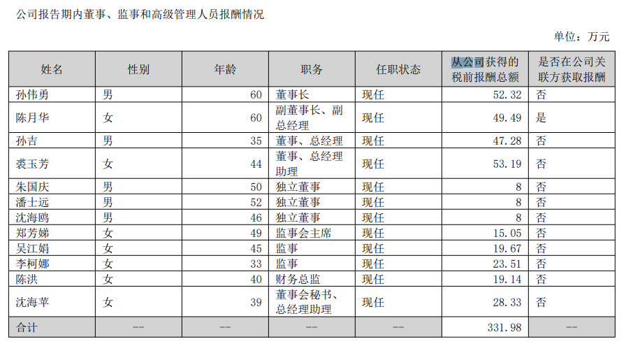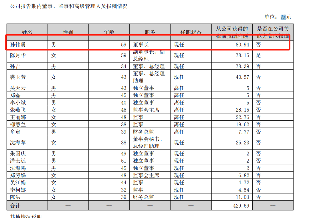 亿田智能董事长孙伟勇2024年从公司获得的税前报酬总额52.32万元,较2023年同期的80.94万元,降幅为35%。
