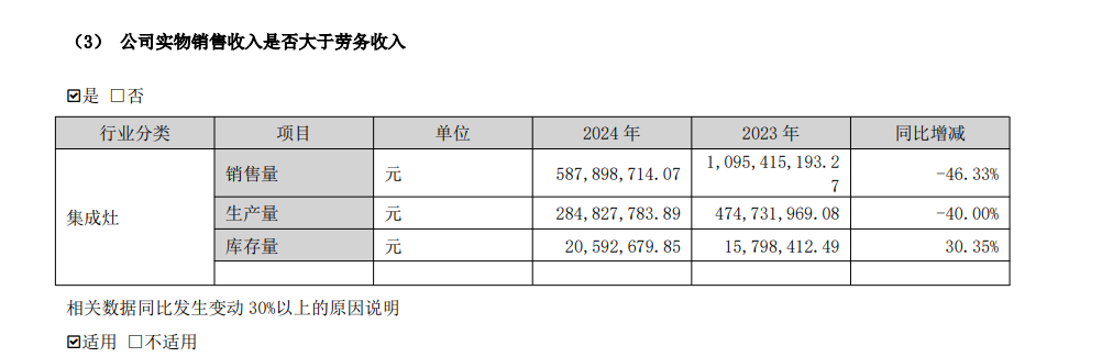 2024年,亿田智能集成灶销售量5.88亿元,同比减少46.33%;生产量2.85亿元,同比减少40%。