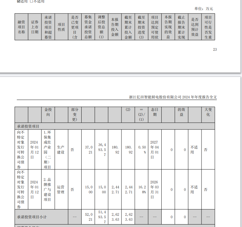 此外,2023年末,亿田智能曾发行可转债募集资金5.2亿元,扣除相关费用后的募资净额5.15亿元,分别投入到环保集成灶产业园(二期)项目、品牌推广与建设项目。