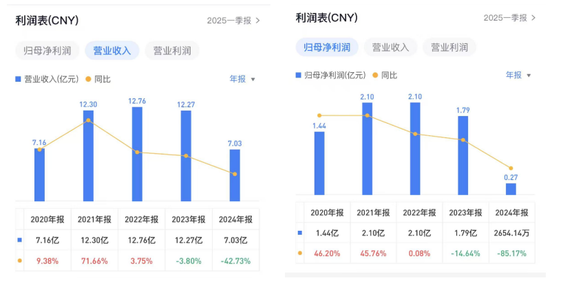 业绩方面,2024年,亿田智能实现营业收入7.03亿元,同比下降42.73%;归属于上市公司股东的净利润2654.14万元,同比下降85.17%;扣除非经常性损益后的净利润(扣非净利润,下同)1124.74万元,同比下降93.17%。