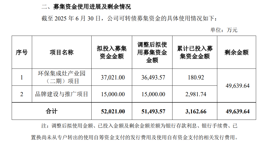 公告显示,亿田智能2023年通过发行可转债募资5.20亿元,原计划投入环保集成灶产业园扩建及品牌推广。但截至2025年6月30日,两大项目实际投入进度均未完成: