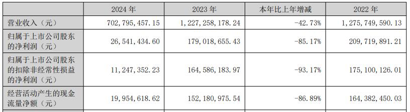 2024年,公司实现营业总收入7.03亿元,同比下降42.73%;归属于上市公司股东的净利润2654.14万元,同比下降85.17%;归属于上市公司股东的扣除非经常性损益的净利润1124.74万元,同比下降93.17%;经营活动产生的现金流量净额为1995.46万元,同比下降86.89%。
