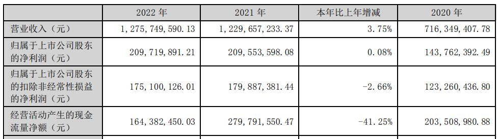 2022年,亿田智能营业收入同比增长3.75%,归属于上市公司股东的净利润同比增长0.08%,归属于上市公司股东的扣除非经常性损益的净利润同比下降2.66%。