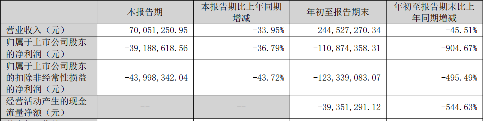 亿田智能(300911.SZ)日前发布2025年三季度报告。2025年前三季度,该公司实现营业收入2.45亿元,同比下降45.51%;实现归属于上市公司股东的净利润-1.11亿元,同比下降904.67%;实现归属于上市公司股东的扣除非经常性损益的净利润-1.23亿元,同比下降495.49%;经营活动产生的现金流量净额为-3935.13万元,同比下降544.63%。