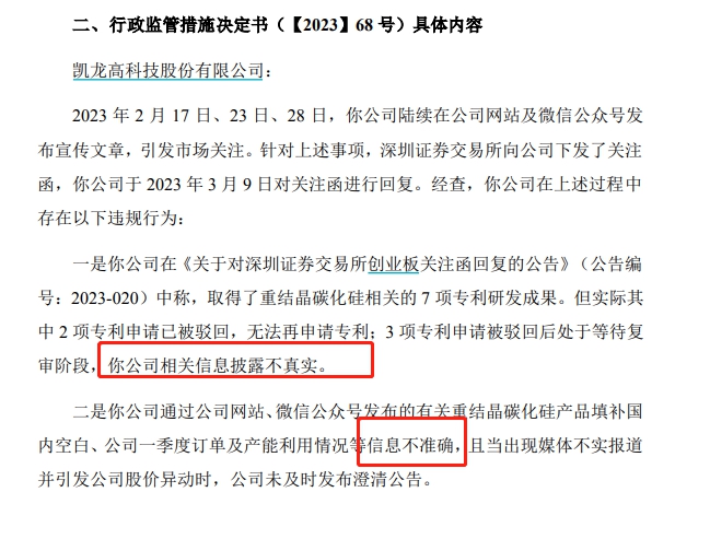 凯龙高科更正称,经公司核查,由于工作人员疏忽造成原公告部分内容出现信息不完整、不准确的情形,现将原公告相关内容更正并澄清如下:公司重结晶碳化硅相关专利实际情况为2项获得授权;2项专利申请被驳回,无法再申请专利;3 项专利申请被驳回后处于等待复审阶段。公司实际获授专利为2项。