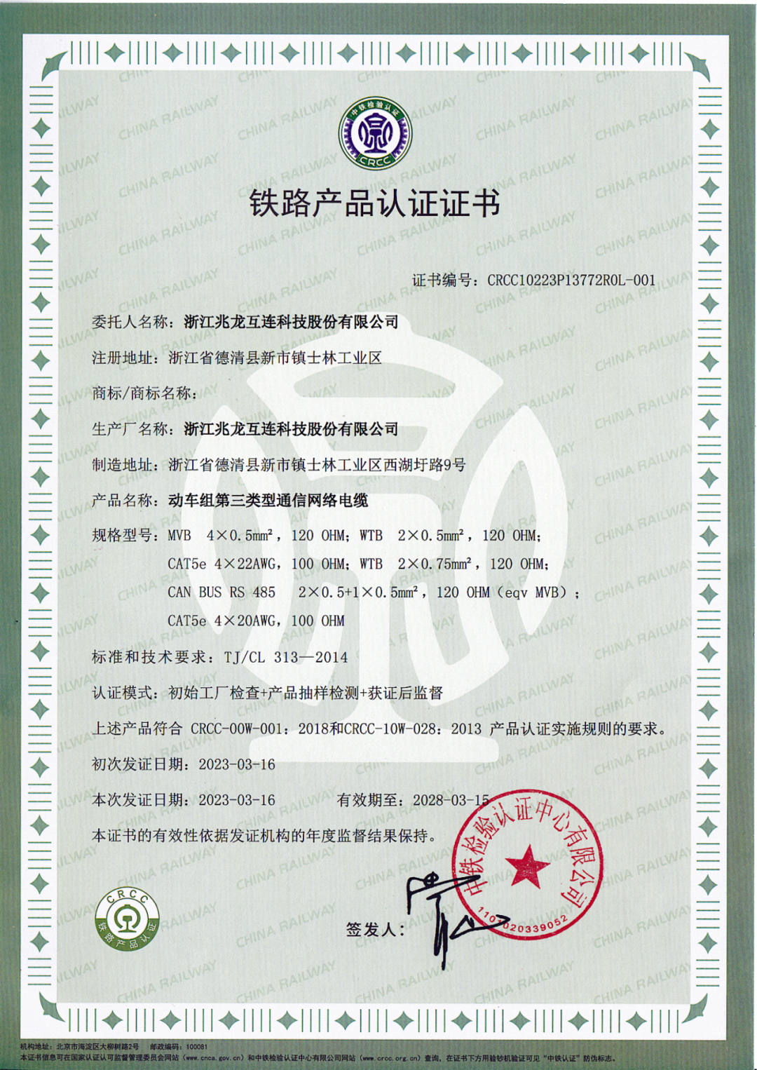 2023年3月16日,兆龙互连顺利通过CRCC(中铁检验认证中心有限公司)现场审核与认证(证书编号:CRCC10223P13772R0L-001)。CRCC认证是我国铁路行业产品的权威性认证,是实施铁路产品和城市轨道交通装备认证、管理体系认证及产品检验检测、校准等技术服务的第三方机构。