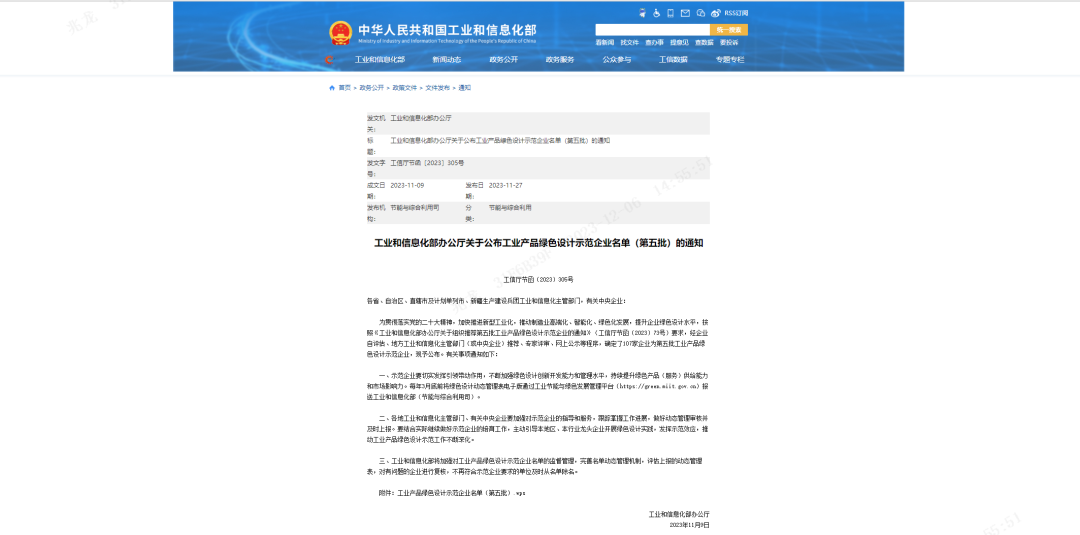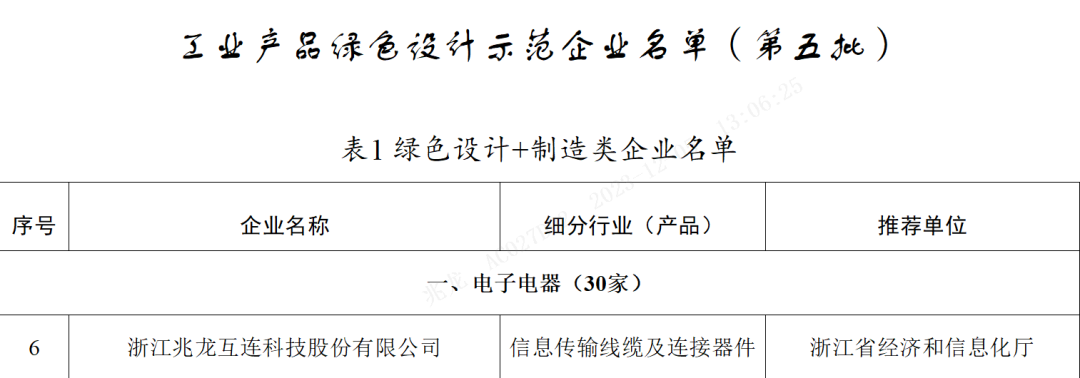 近日,国家工业和信息化部官网公布了第批工业产品绿色设计示范企业名单,共计107家企业获得认定,浙江兆龙互连科技股份有限公司(简称“兆龙互连”)榜上有名。