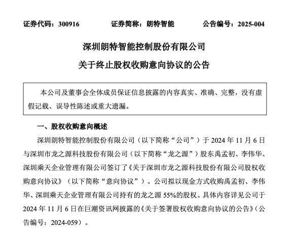 1月21日,深圳朗特智能控制股份有限公司(以下简称“朗特智能”)发布公告,宣布终止此前与深圳市龙之源科技股份有限公司(以下简称“龙之源”)股东签订的股权收购意向协议。同时,朗特智能还发布了2024年度业绩预告。