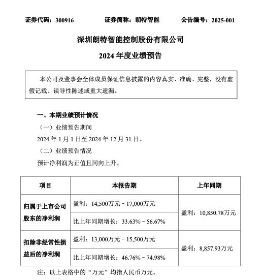 朗特智能预计2024年净利润为1.45亿元至1.7亿元之间,同比增长33.63%~56.67%;扣除非经常性损益后的净利润为1.3亿元至1.55亿元之间,同比增长46.76%~74.98%。