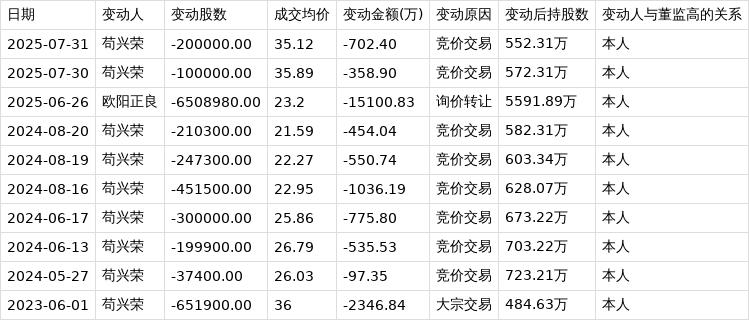 深交所公开信息显示,7月31日,朗特智能监事苟兴荣在竞价交易公司股票,减持股数20.00万股,成交均价35.12元,变动金额702.40万元,变动后持股数为552.31万股。