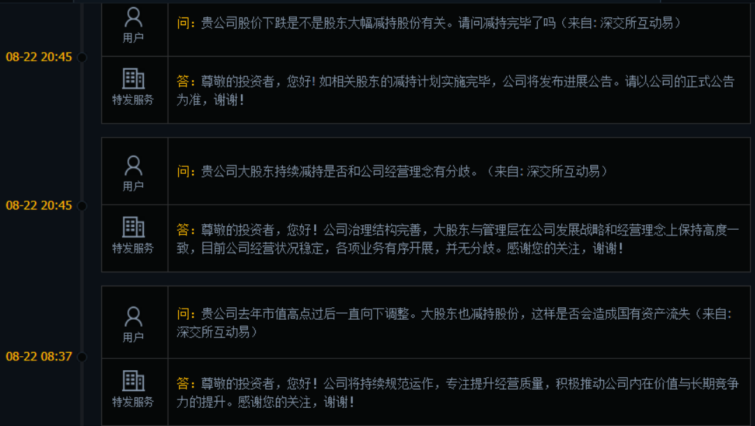 特发服务的股东频繁减持的也引起了投资者的关注。每经资本眼专栏记者注意到,在深交所互动易平台上,有不少留言是关于股东减持的问题。