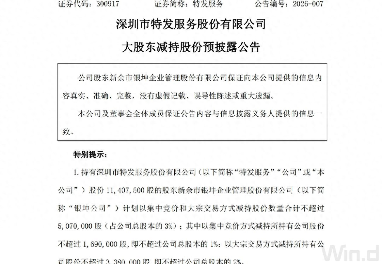 近日,深圳国资系上市公司特发服务(300917.SZ)发布大股东减持预披露公告,公司持股6.75%的股东新余市银坤企业管理股份有限公司(下称“银坤公司”),计划以集中竞价和大宗交易方式合计减持不超过507万股,占公司总股本的3%,减持期限为2026年2月13日至5月12日。
