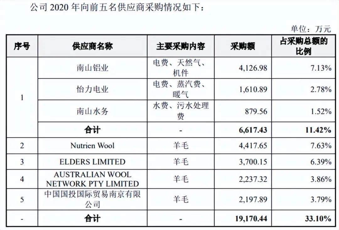 在前次再融资的募集说明书申报稿中,南山铝业(600219)(600219.SH)、山东怡力电业有限公司、龙口市南山水务有限公司合并构成南山智尚2020年的第一大供应商,该年南山智尚共发生的采购金额为6,617.43万元,其中向南山铝业采购金额为4,126.98万元。该年南山智尚向第二大供应商则为Nutrien Wool,向其采购金额为4,417.65万元。