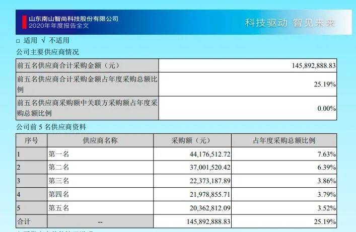 但在南山智尚的2020年年报中却显示,其向第一大供应商的采购金额为4,417.65万元,即应该就是对应募集说明书中向Nutrien Wool的采购额,由此或可推断,2020年年报列示的前五大供应商中并未将南山集团控制的三家公司合并计算在内。而且该年南山智尚仅向南山铝业的采购额(4,126.98万元)已超过年报中第二名供应商的金额(3,700.15万元),不知道哪一份公告的信披真实准确?