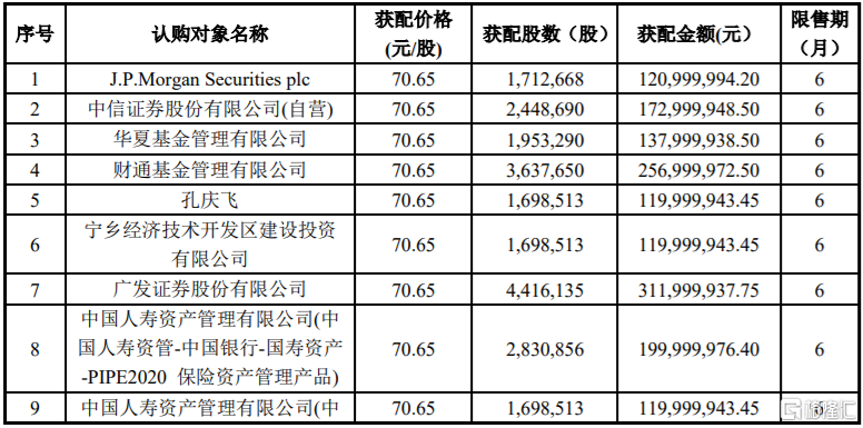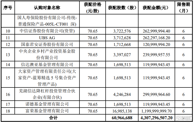 11月21日丨中伟股份(300919.SZ)公布2022年度向特定对象发行股票发行情况报告书,此次发行价格70.65元/股,发行股数6096.6688万股,募集资金总额约43.07亿元。此次发行对象最终确定18家。配售结果如下: