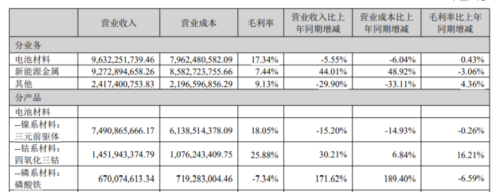 值得一提的是,电池材料业务中,镍、钴、磷、钠四系产品出货量正向增长,产品销售量超18.8万吨,同比增长33.91%。这也意味着电池材料出现了增量不增收的情况。