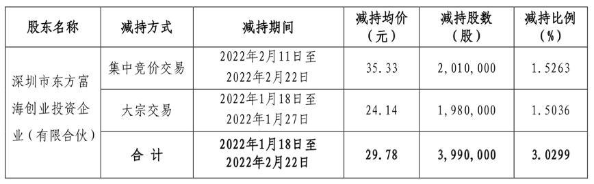 具体来看,2月11日至22日期间,东方富海通过集中竞价方式减持201万股,减持均价为35.33元,减持比例为1.53%,套现7101万元;此外,1月18日至1月27日,东方富海还通过大宗交易方式减持198万股,减持均价为24.14元,减持比例为1.5%,套现4779万元。综上,东方富海此次提前完成了原定六个月的减持计划,减持均价为29.78元,共减持套现约1.19亿元。