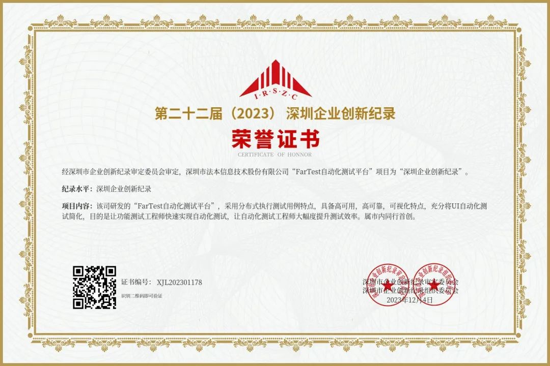 法本信息在本届评定中凭借行业领先的自主研发能力、产品核心技术和科技成果转化水平获评“自主创新标杆企业”荣誉称号。“FarTest自动化测试平台”经审定获评“深圳企业创新纪录”,成为继FarAI人工智能开放平台、FarData大数据敏捷开发平台等之后,法本信息再次获此殊荣的产品。